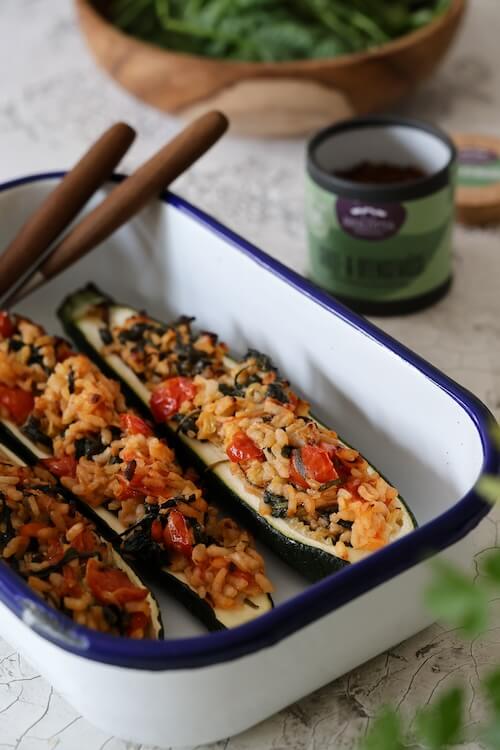 Gefüllte Zucchini mit Risotto & Parmesan sind das perfekte Gericht für alle, die Gemüse lieben und auf cremige Reisküche stehen. Das milde Zucchinigemüse trifft hier auf ein aromatisch abgeschmecktes Tomaten-Risotto mit Babyspinat und feinem Parmesan. Eine wunderbar unkomplizierte Ofenidee – perfekt für leichte Alltagsküche!